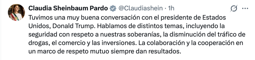 “La colaboración y la cooperación en un marco de respeto mutuo siempre dan resultados”, afirmó Sheinbaum, enviando un mensaje de estabilidad a los mercados y a la ciudadanía.