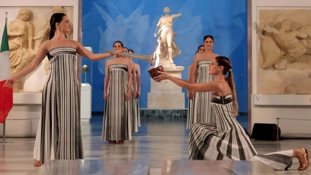 La actriz griega Mary Miná, en su papel de Gran Sacerdotisa, fue la encargada de encender la antorcha utilizando el tradicional llamado a Apolo, manteniendo viva la conexión simbólica entre los Juegos de la Antigüedad y los modernos.